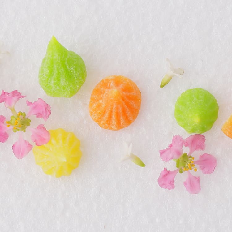 使用可食用花卉製成的花之巴伐利亞果凍。配合季節花卉的配色及平衡,能夠品嘗更美麗、更好吃的組合。這道漂亮的和菓子只能在此購買到,並僅限外帶。