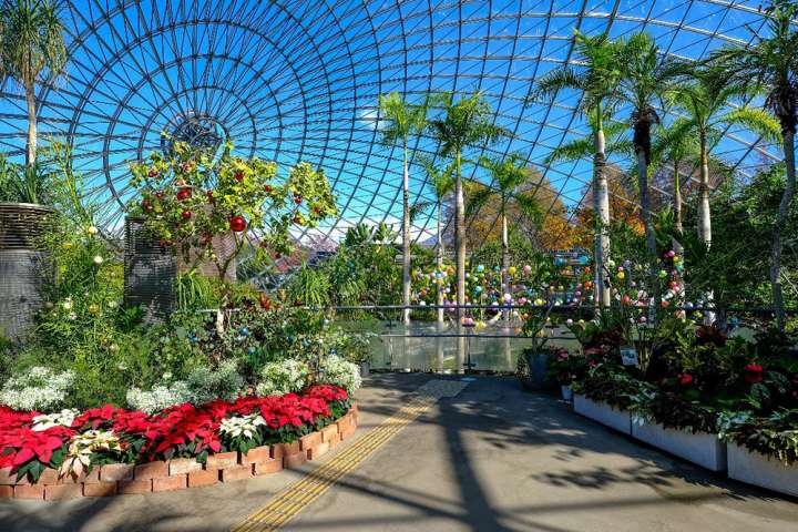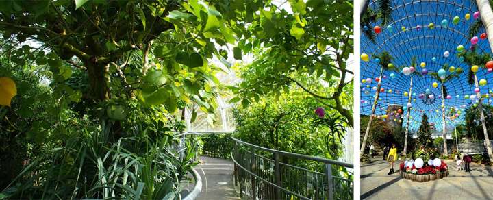 走進花卉巨蛋瞧瞧~花卉巨蛋是直徑達50m、高度21m的大型半球體玻璃溫室,以地球為造型的元素,是花迴廊的代表建築。即使到了冬天,溫室內的溫度也會維持在15度以上,這裡栽種了大王椰子樹、芭蕉等各式熱帶、亞熱帶花卉植物。