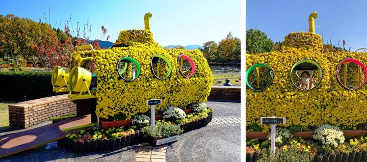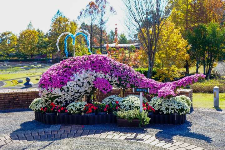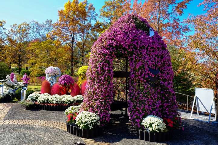 每年秋天,霧之庭園旁都會舉辦「菊の造型園藝展」,今年的主題為「歡迎來到海洋冒險世界~陸地上的海底大冒險~」。利用日本傳統花藝技術「懸崖菊」,創造出各種生動又華麗的園藝作品。入口處的大白鯊正張大著嘴巴靜待各位「獵物」的到來喔!