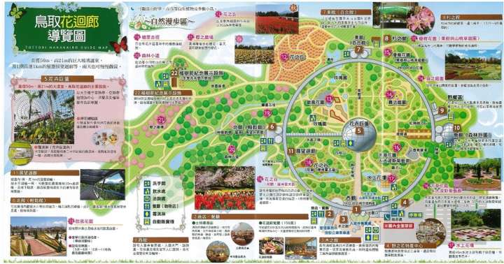 鳥取花迴廊內有許多別具特色的主題園區,如花之丘、花之谷、水上花壇、霧之庭園、歐風花園等,以花卉巨蛋為中心,東西南北分別為百合館、出入口大門、森林巨蛋、和自在館,並由長達一公里的圓形展望迴廊連接了四個館,「花迴廊」的名稱即由此展望迴廊而來。無論是迴廊或各主題園區,道路大多平坦,因此嬰兒車或輪椅皆能暢行無阻。接下來,就請大家和我同遊秋日的花迴廊吧!出發~