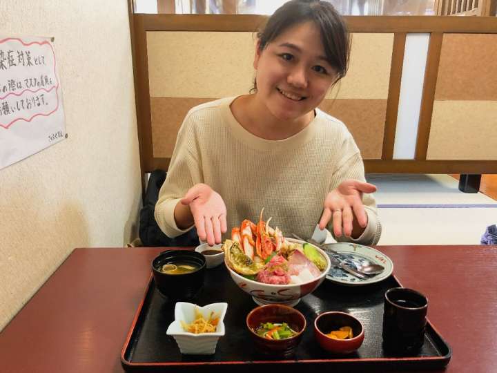 我點的海鮮螃蟹丼上桌囉!有松葉蟹的蟹腳、蟹膏、生魚片和鮪魚泥,並加上味噌湯與三道小菜。