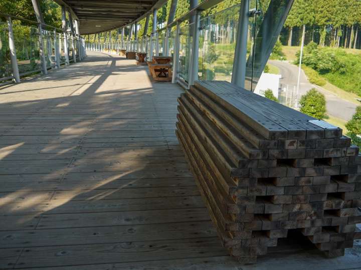展望迴廊全段都設有屋頂,因此即使天候不佳,仍可優雅的飽覽園內風光,迴廊內許多座椅是由米子工業高等專門學校的學生親手打造的,創意十足!走累了不妨來展望迴廊,挑張喜歡的椅子坐坐吧!