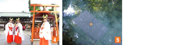 是以戀愛之神聞名,女性參拜客絡繹不絕的神社。特別是在距離拜殿徒步3分鐘左右的內側庭院的「鏡之池」進行的戀愛占卜頗受好評。在神社辦事處購買1張100圓日幣的占卜用紙,放上100圓日幣或10圓日幣硬幣並將其放入池中。據說15分鐘以內沈入水中的話,將會很快就能結良緣!請務必一邊想著心上人一邊來挑戰看看!
