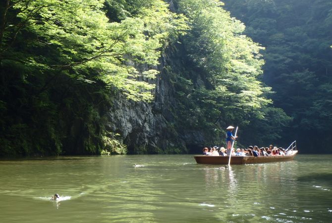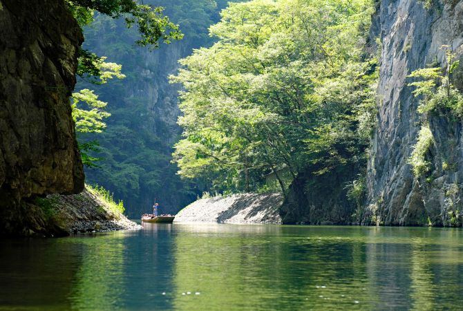 Cách tốt nhất để chiêm ngưỡng Hẻm núi Geibikei là ở trên thuyền đáy bằng kiểu Venice. Hẻm núi có những vách đá dựng đứng ở hai bên với một số tạo hình đá độc đáo. Trên đường trở về bến tàu, người lái thuyền sẽ hát cho bạn nghe khúc nhạc chiều truyền thống.