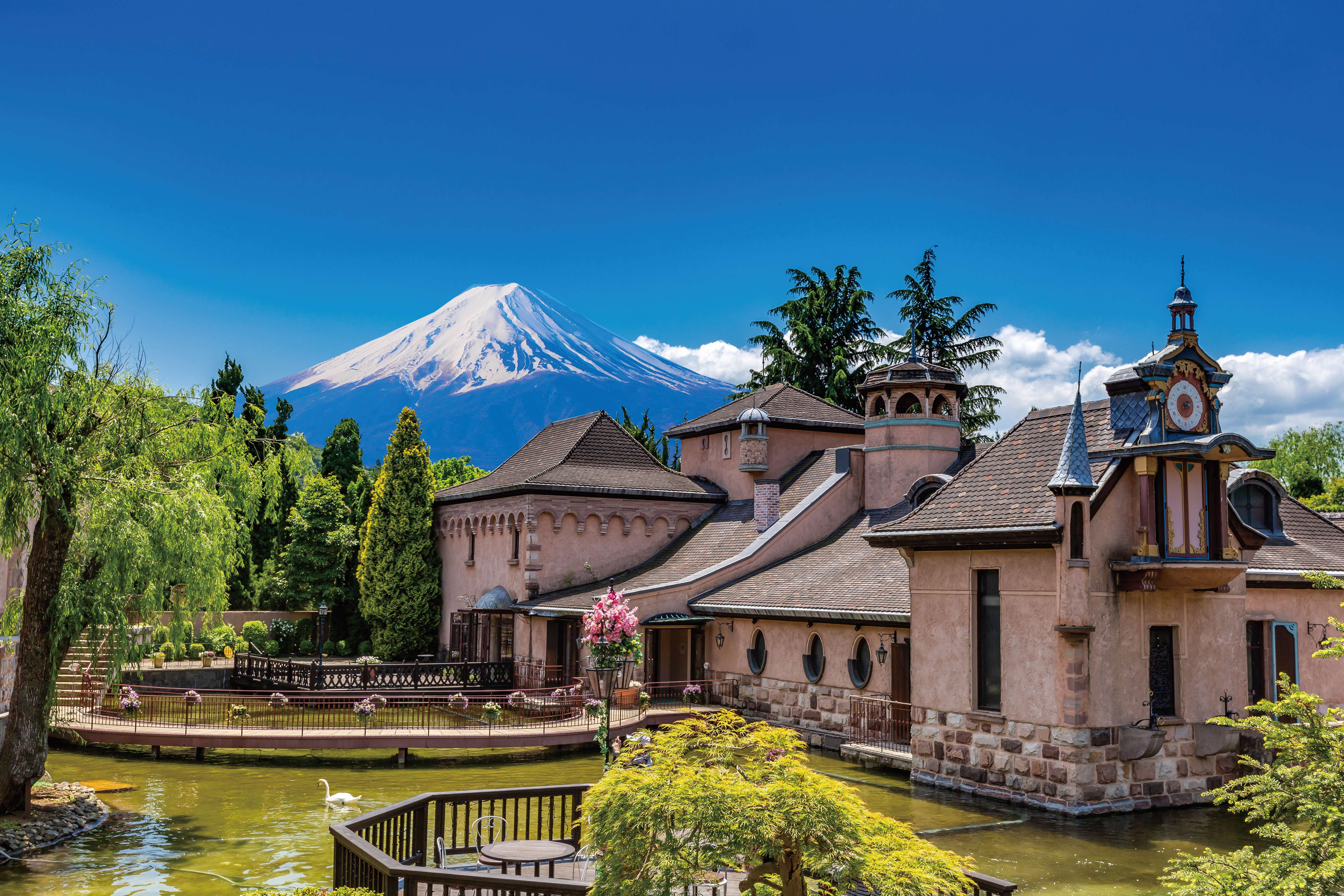 Nếu bạn muốn ngắm nhìn núi Phú Sĩ thì hãy đi ra công viên bên ngoài nhé! Dọc theo con đường mòn trong công viên là các nhà hàng, cửa hàng và điểm nhấn chính ở đây là vườn hồng với khoảng 3500 bông hồng thuộc 720 loài hoa khác nhau. Vườn hồng thường sẽ nở rộ vào tháng 6, tạo nên khung cảnh lộng lẫy với khung cảnh núi Phú Sĩ ở phía xa.
