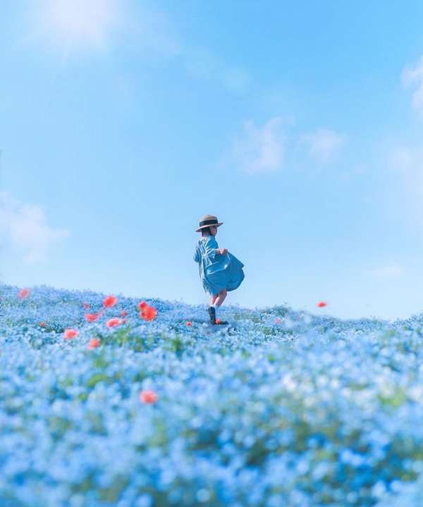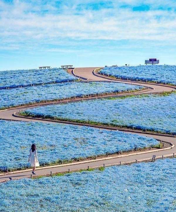 Đến với đồi hoa nemophila ở Công viên Hitachi Seaside Park bạn sẽ được chiêm ngưỡng vẻ đẹp của bộ ba sắc xanh được kết hợp bởi bầu trời xanh trong, biển xanh thẳm và đồi hoa xanh biếc. Từng bông nemophila nhỏ nhẹ nhàng đung đưa trong gió giữa không gian rộng lớn làm ta cảm nhận như đang ở một thế giới khác xa cuộc sống bận bịu ngày thường. Đừng quên trải nghiệm ngắm toàn cảnh đồi hoa từ vòng đu quay khi ghé thăm nơi này nhé!