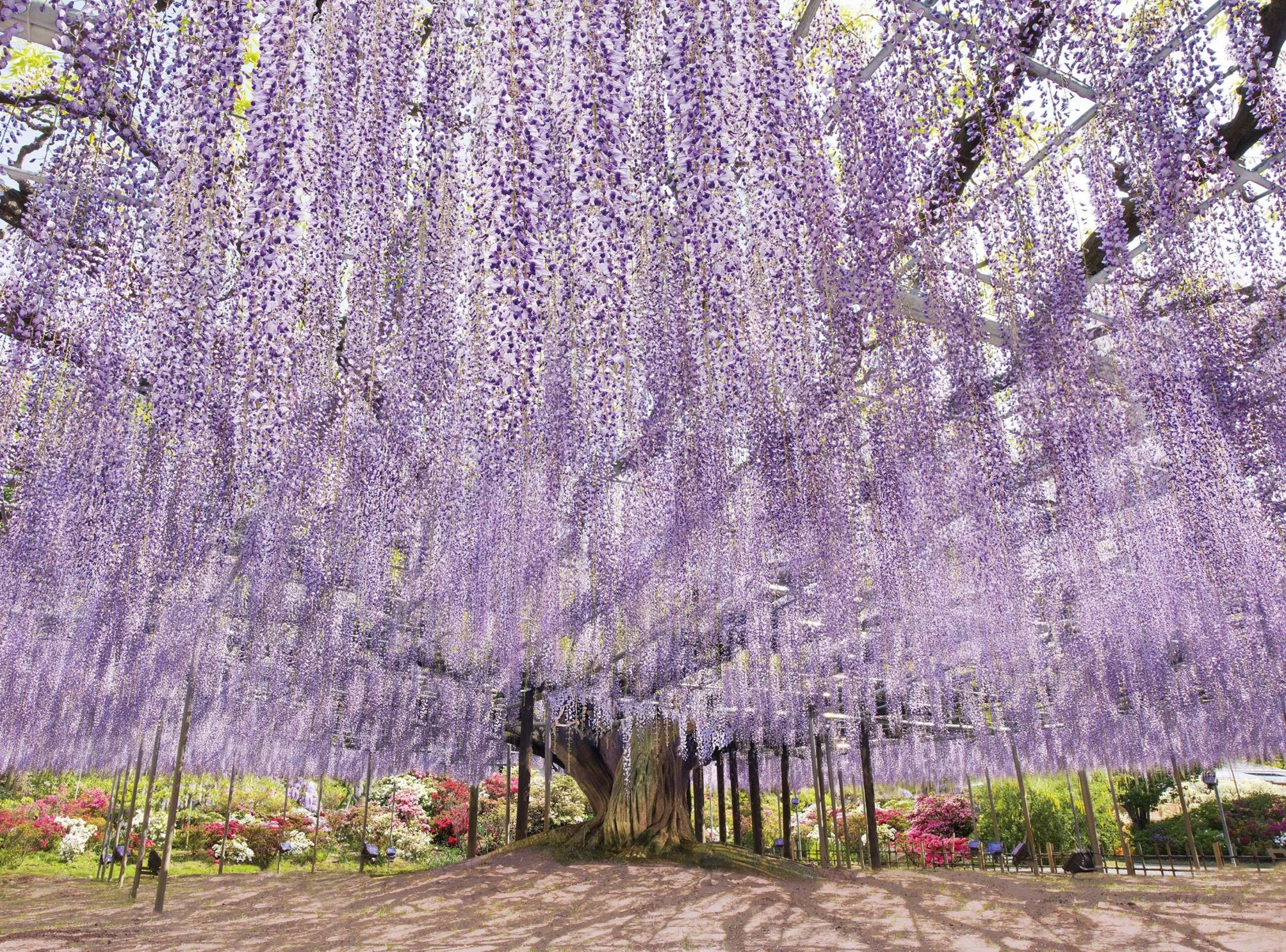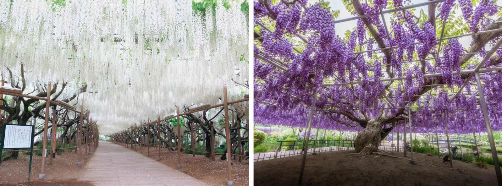 Hoa tử đằng thường bước vào thời điểm đẹp nhất từ cuối tháng 4 đến đầu tháng 5 hằng năm. Trong khuôn viên công viên, hơn 350 giống hoa tử đằng khoe sắc rực rỡ, nổi bật là giàn tử đằng khổng lồ hơn 160 năm tuổi được công nhận là Di sản thiên nhiên cấp tỉnh Tochigi – nơi những dây leo vươn cao, tạo thành mái vòm với nhiều chùm hoa rủ xuống mềm mại, mang đến khung cảnh vô cùng ấn tượng.