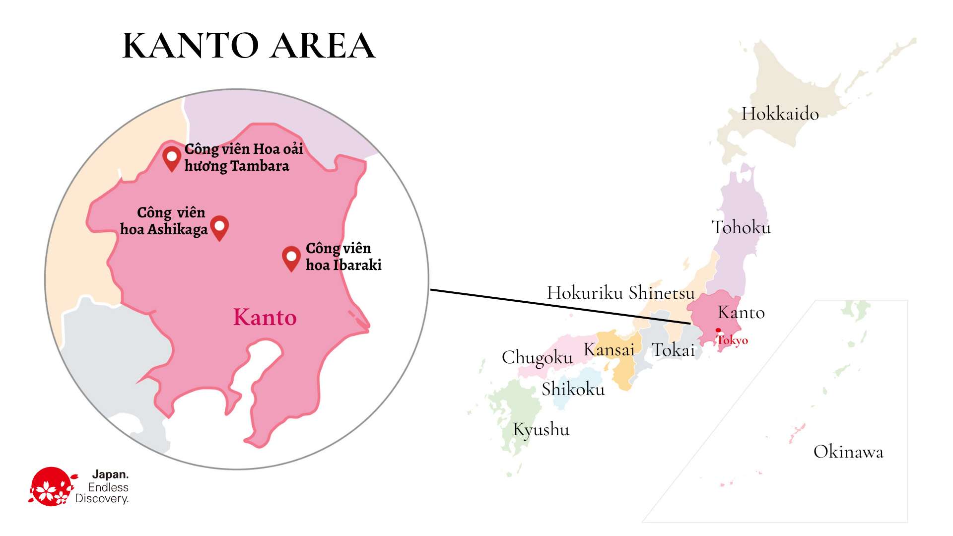 Nằm ở trung tâm Nhật Bản và là nơi tọa lạc của thủ đô Tokyo, vùng Kanto vừa là trung tâm chính trị, kinh tế và văn hóa của cả nước, vừa sở hữu nhiều công viên và cao nguyên giàu thiên nhiên. Chỉ cần đi xa trung tâm một chút, du khách đã có thể tận hưởng vẻ đẹp thiên nhiên cùng cảnh sắc đặc trưng của bốn mùa.
