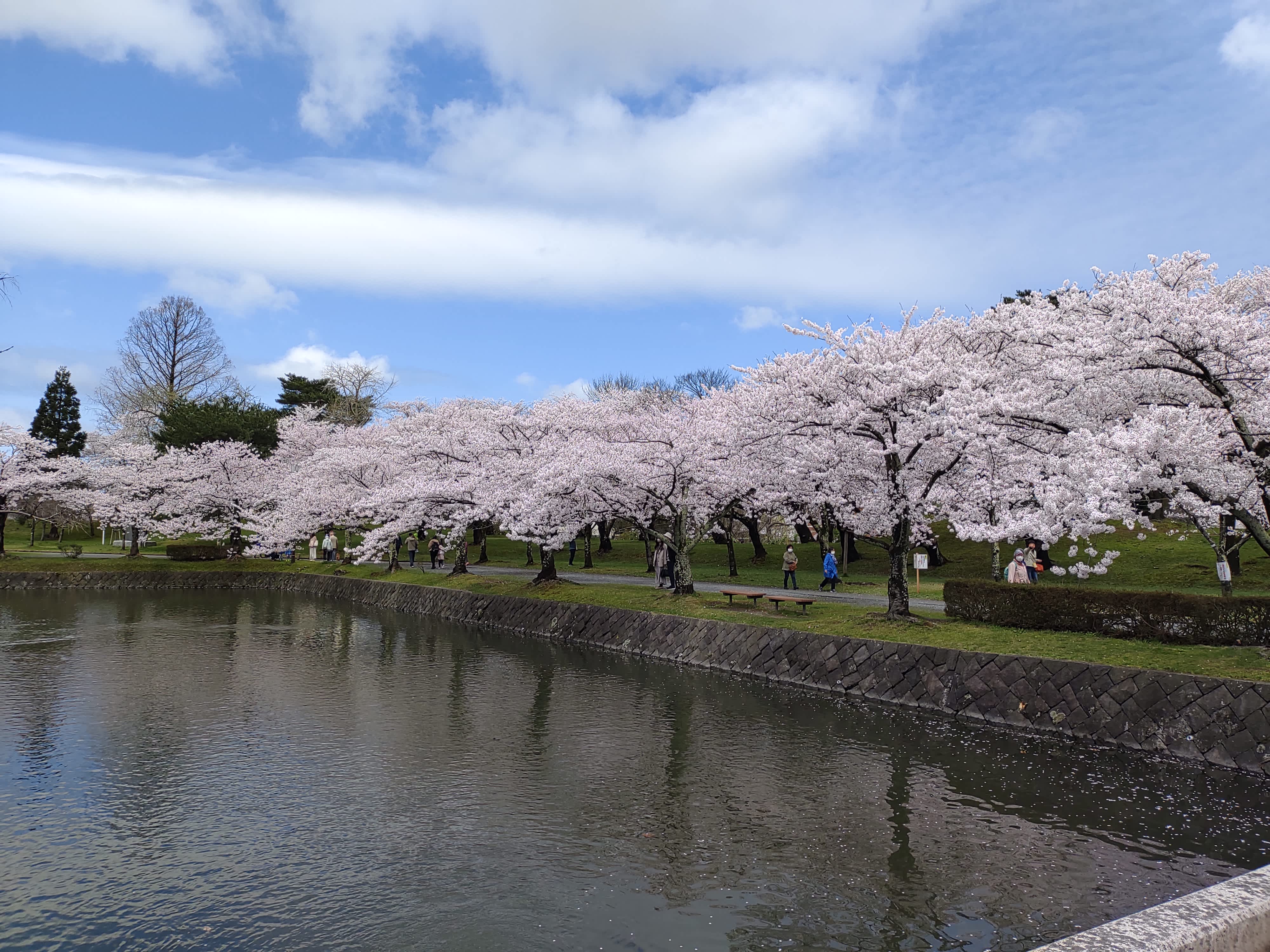Với hơn 700 cây anh đào, bao gồm Somei Yoshino (anh đào Yoshino) và Yae-Zakura (anh đào cánh kép), công viên này được xếp vào top 100 điểm ngắm hoa anh đào đẹp nhất Nhật Bản. Hình ảnh những cánh anh đào nở rộ bên những cây tuyết tùng, tường đá, hay hào nước dễ dàng hớp hồn bất cứ ai. Rất nhiều nhà làm phim đã chọn khung cảnh tuyệt đẹp này để đưa lên màn ảnh nhỏ, ví dụ bộ phim truyền hình Hana no Ato (Theo dấu hoa xưa).