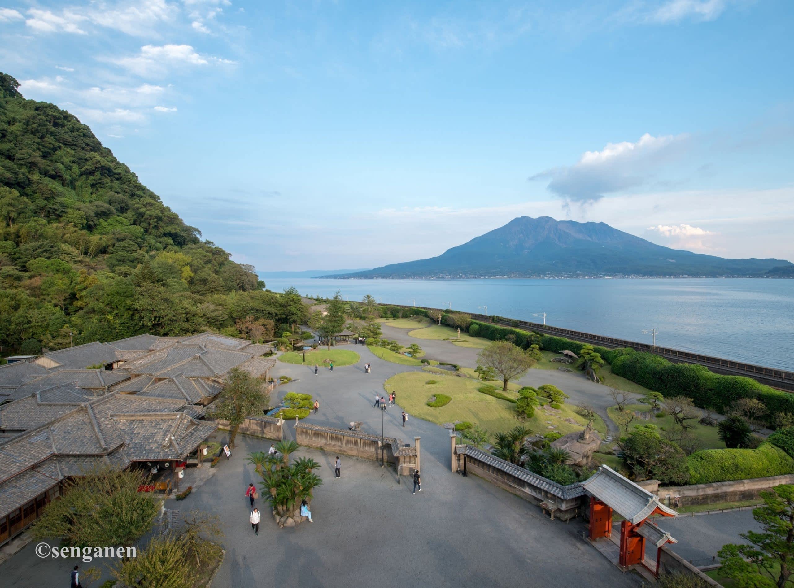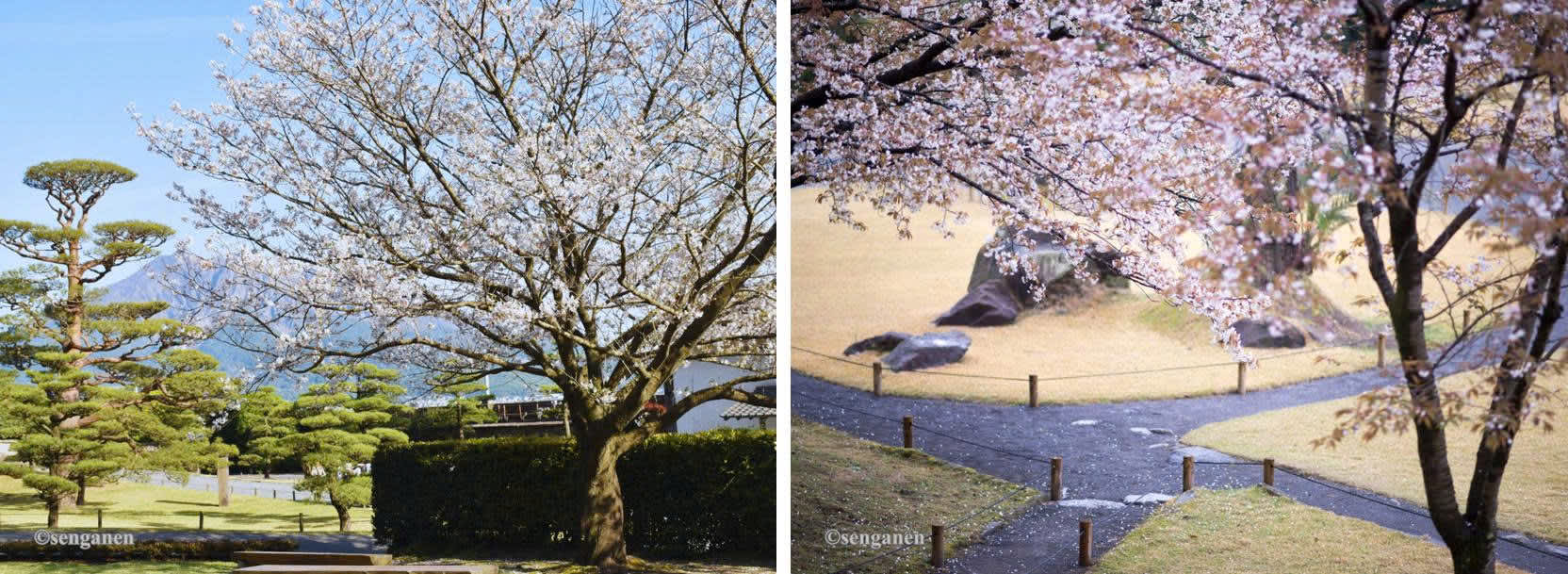 Sengan-en là khu vườn lâu đời toạ lạc tại thành phố Kagoshima. Vào đầu tháng 2, những cánh hoa anh đào Kanhizakura hồng đậm bắt đầu khoe sắc, đến đầu tháng 4, các giống anh đào hồng nhạt như Someiyoshino lại tô điểm thêm sắc xuân cho khu vườn. Điểm đặc biệt của Sengan-en là tầm nhìn hướng ra núi lửa Sakurajima đang hoạt động phía bên kia mặt biển – một cảnh tượng hiếm có trong các khu vườn Nhật Bản. Sengan-en mang đến bức tranh phong cảnh độc đáo, nơi thiên nhiên hùng vĩ và nghệ thuật cảnh quan truyền thống hòa quyện làm một.