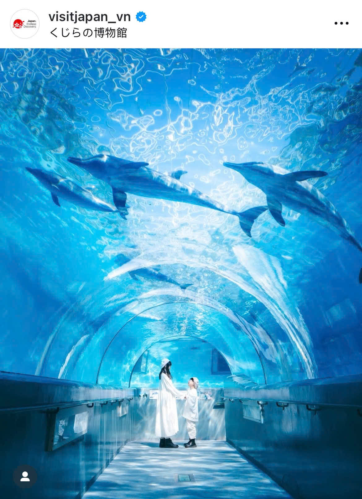 Sự độc đáo trong thiết kế của Bảo tàng cá voi Taji (tỉnh Wakayama) khiến người tham quan như đang dạo bước dưới đại dương xanh thẳm cùng đàn cá bơi xung quanh, đây cũng là lý do khiến bức ảnh này nhận được rất nhiều “tim” từ fan yêu Nhật Bản.
