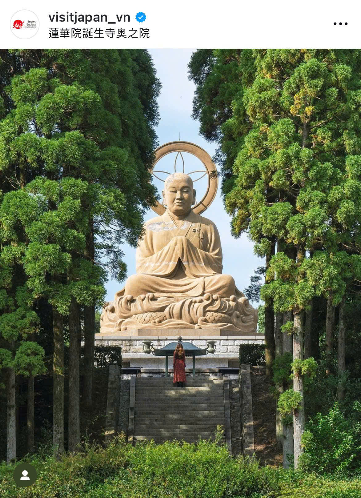 Chùa Rengein Tanjoji Okunoin (tỉnh Kumamoto) với bức tượng Phật uy nghi hiện lên giữa 2 hàng cây cao vút tạo nên sự đối lập mạnh mẽ với hình ảnh cô gái nhỏ bé đứng phía trước, gây ấn tượng và thu hút rất nhiều “tim” từ các fan.