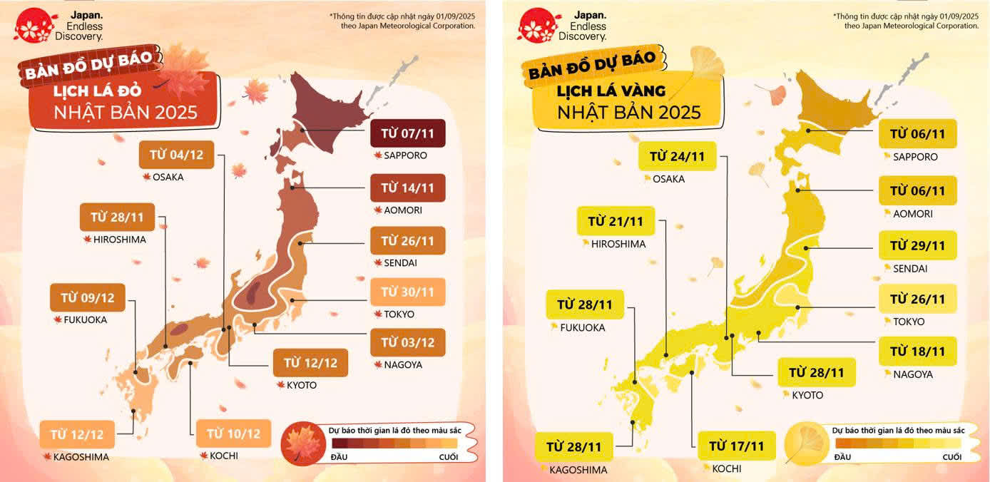 “Lịch dự báo lá đỏ và lá vàng năm 2025” đã được công bố trên trang facebook chính thức của JNTO. Mùa lá đỏ lá vàng đang đến gần, Nhật Bản đã sẵn sàng chờ đón du khách ghé thăm!