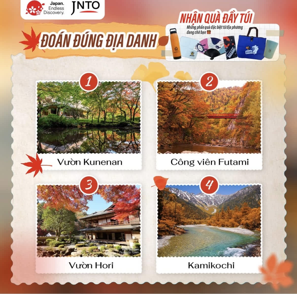 JNTOハノイ事務所では、ベトナム市場向け公式Facebookにおいて、日本国内の地方DMO・自治体と連携したキャンペーン企画を実施しました。内容は、「日本の秋の景色」をテーマに選定した4つの観光スポットと正しい都道府県の組合せを当てるもので、今回は当事務所がが地方誘客のため重点的にプロモーションを行っている「北海道」「中部地方」「中国地方」「九州地方」を取り上げました。(重点地域は、近年ベトナムでの需要が高まりつつあるエリア、ベトナムから直行便が就航するエリアを選定。)また、正解者の中から抽選でお渡しする景品については、地方DMO・自治体の皆様からもご提供いただき、ゲーム形式とすることでよりインタラクティブに地方の魅力を発信することを目指しました。本投稿は11月12日に実施し、11月18日時点で約350名の参加者を集めています。