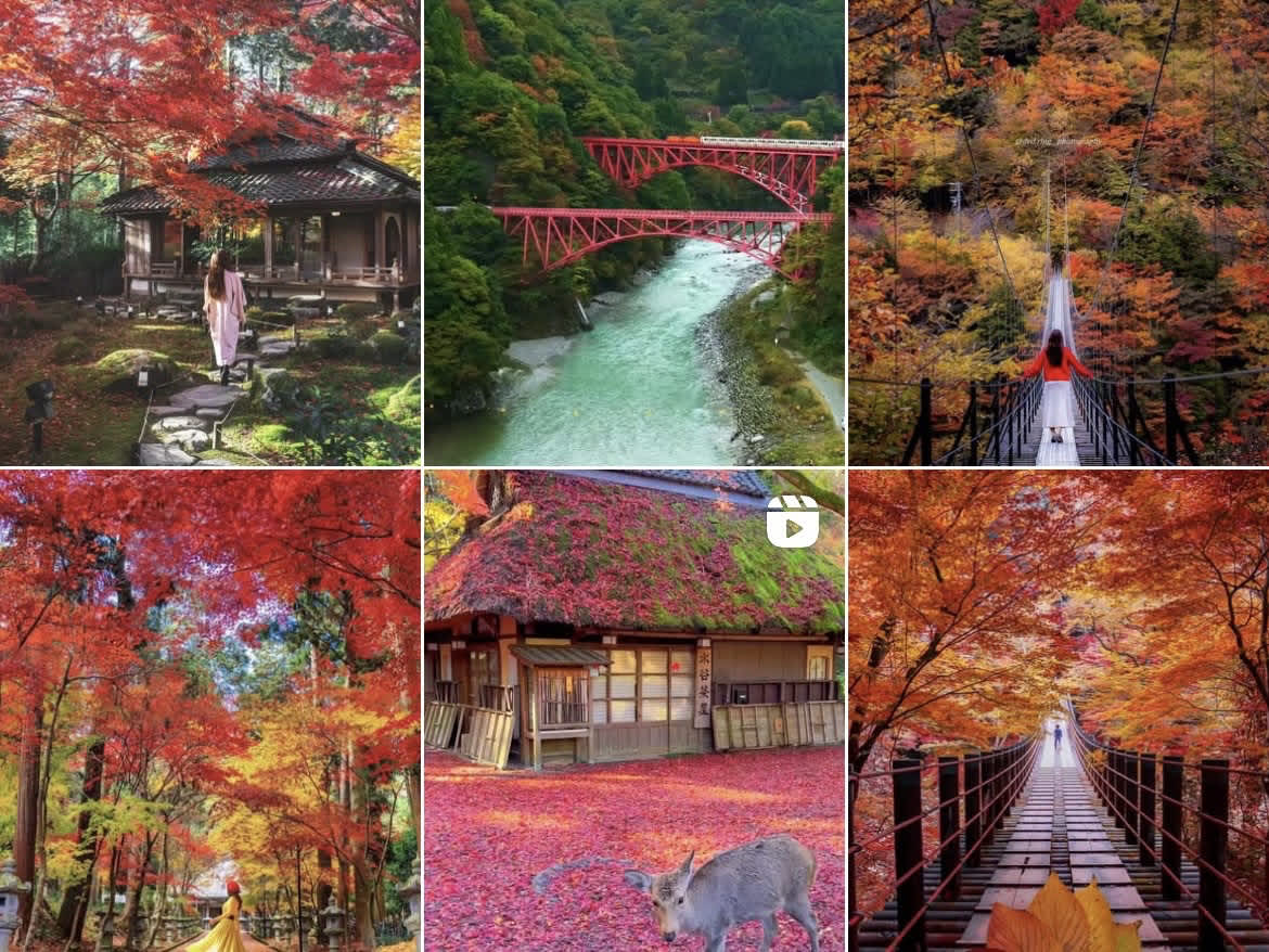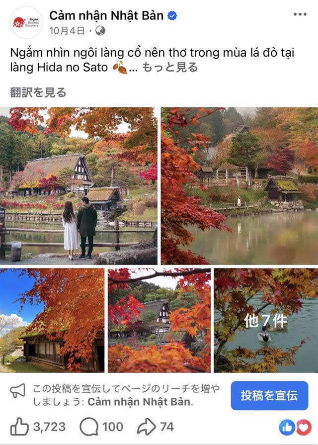 写真は伝統的な日本の村の魅力を鮮やかな秋の色で見せており、さらに最初の写真の二人がロマンチックな雰囲気を作る本投稿は、高いエンゲージメントを獲得しました。